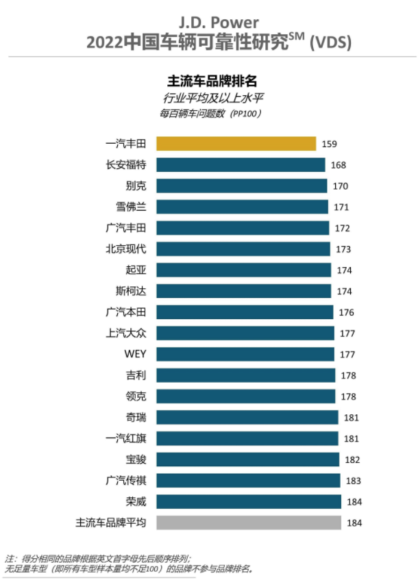 一汽丰田(159个PP100)荣获主流车品牌可靠性第一。长安福特(168个PP100)别克(170个PP100)分列主流车品牌第二和第三。
