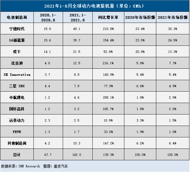 前8月全球动力电池装机量:宁德时代份额达30.3%
