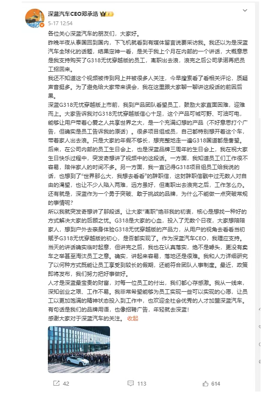 “让大家‘离职’绝非我的初衷,核心是想找一种好的方式解决大家的后顾之忧。”5月17日晚间,深蓝汽车CEO邓承浩在微博上针对前几日让员工买车后“离职”去旅游的言论作出回应。