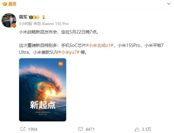 恢复了往日的活跃,5月19日,雷军发布多条微博,其中一条置顶:“小米战略新品发布会,定在5月22日晚7点。”并表示,小米首款SUV小米YU7将迎来正式发布。