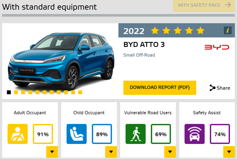 比亚迪ATTO 3获欧洲五星安全认证等级