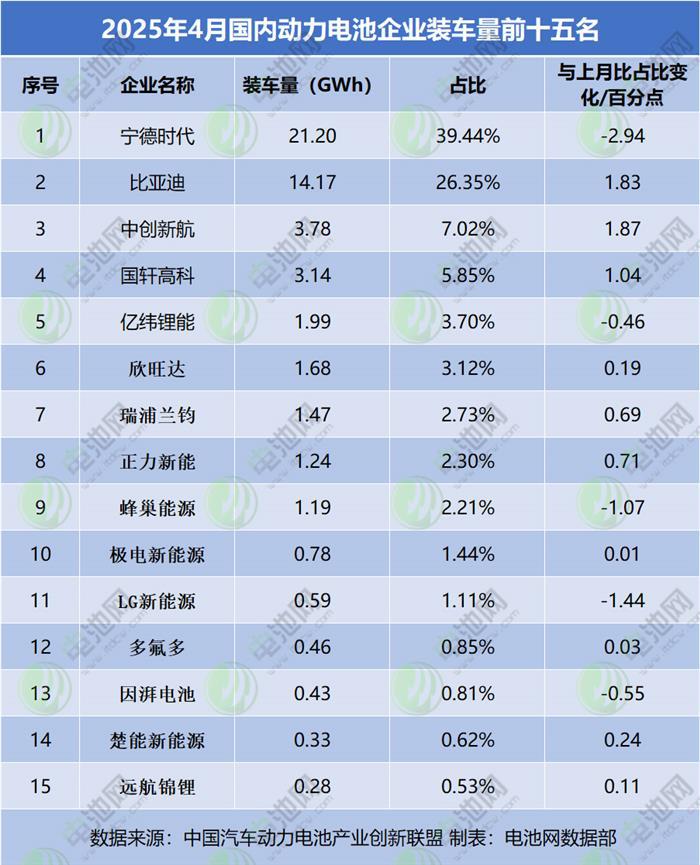 1-4月国内动力电池装车量TOP15:宁德时代连跌 一企业掉出前十