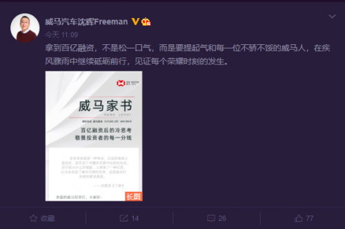 威马汽车沈晖发内部信 ,将提升资金使用效率